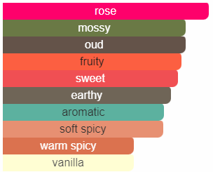 Notat e para ofrojnë një freski të gjallë nga Kasis, Litchi dhe Piperi rozë. Në zemër, Notat e mesme përfshijnë një përzierje të sofistikuar të Trëndafilit, Pralinës dhe Kardamomit, duke sjellë një dimension kompleks dhe lulesh. Notat bazë** me Myshk, Oud dhe Vanilje krijojnë një fund të pasur dhe sensual.